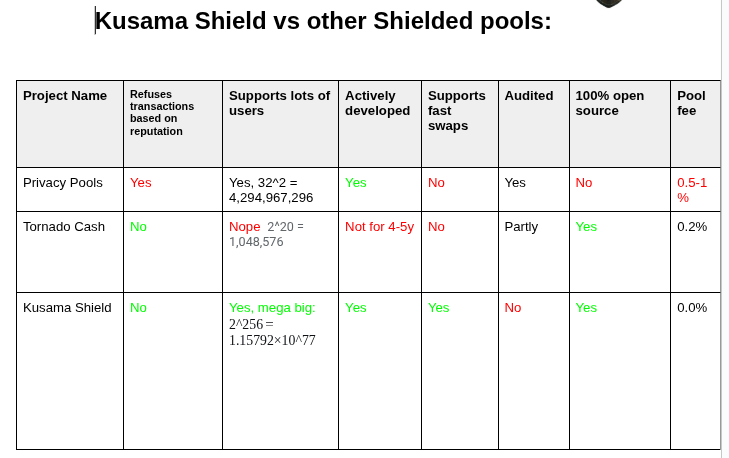 Kusama Shield is a modern shielded pool(smart contract with some zk logic in it), its a smart contract on Kusama Assethub, here is a comparison between the 3 main shielded pools: