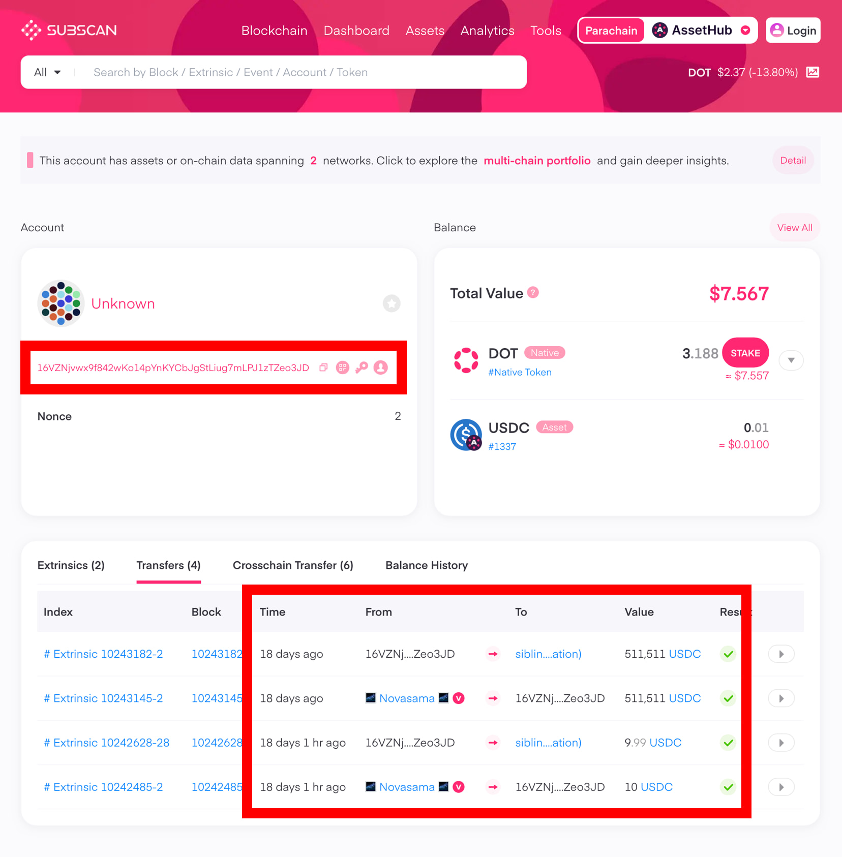 Tracing the Snowbridge transaction back into the Polkadot ecosystem shows that the 524,361 USDC originated from a Novasama controlled account.