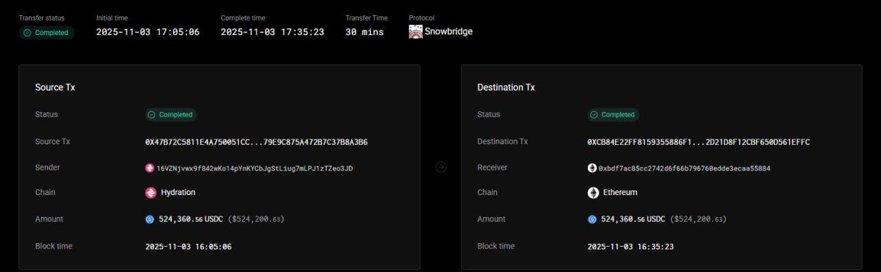 The sender was another Ethereum address that, earlier the same day, received 524,361 USDC through a Snowbridge transfer.